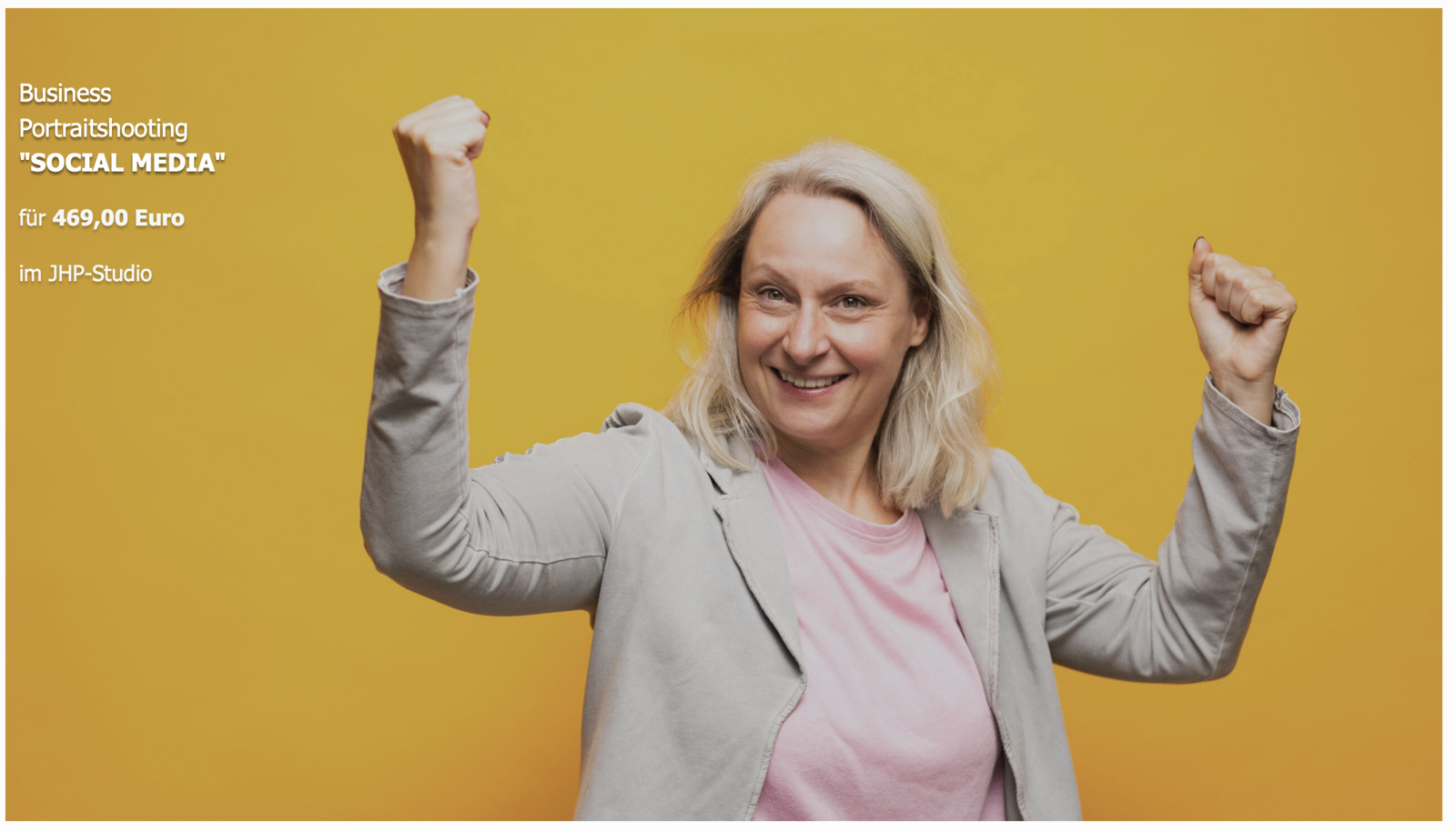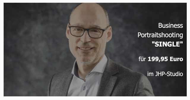 Für 325,00 Euro (inkl. 19 % MwSt.) erhalten Sie ein individuelles 60-minütiges Headshot-Shooting für eine Person im JHP-Studio Hamburg (Wandsbeker Chaussee 56) – inklusive aller Nutzungsrechte, auch für gewerbliche Zwecke.